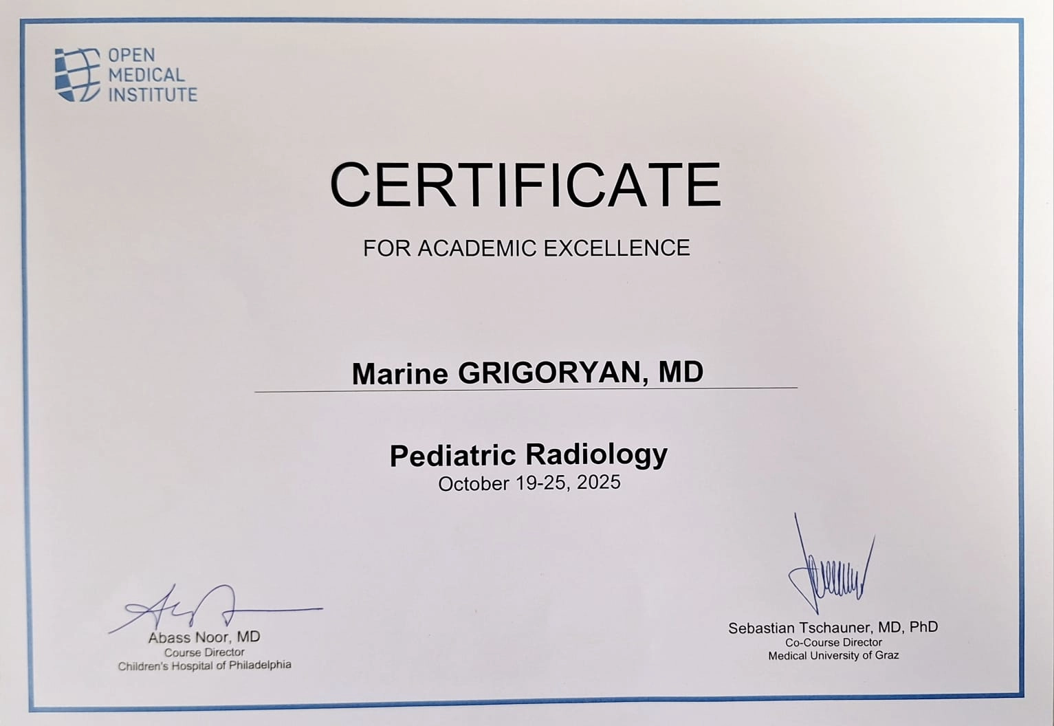 2025 թվականի հոկտեմբերի 19-25-ը Ավստրիայի Զալցբուրգ քաղաքում կայացել է մանկական ռադիոլոգիային նվիրված միջազգային սեմինար, որն անցկացվում է յուրաքանչյուր չորս տարին մեկ անգամ։ «Արաբկիր» բժշկական համալիրի ճառագայթային ախտորոշիչ ծառայության ղեկավար Մարինե Գրիգորյանը և ռադիոլոգ Անի Սարգսյանը միջազգային մասնագիտական հանրությանը ներկայացրել են իրենց աշխատանքային գործունեության մեջ հանդիպած բնածին արատների հետ կապված պաթոլոգիաների մասին, որոնք աշխարհում հանդիպում են խիստ հազվադեպ՝ միլիոններից մեկ մարդու մոտ: