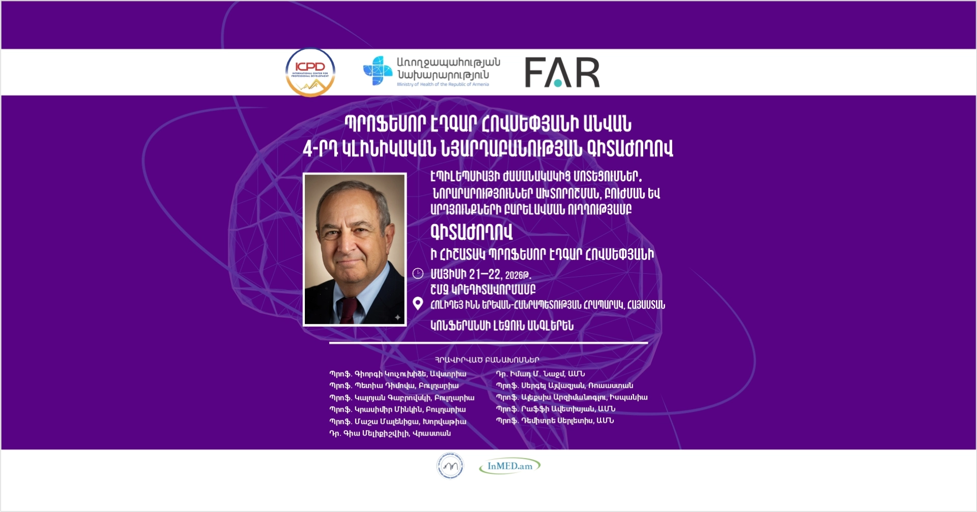 Պրոֆեսոր Էդգար Հովսեփյանի անվան կլինիկական նյարդաբանությանը նվիրված գիտաժողովը արդեն 4-րդ անգամ աշխարհի տարբեր երկրներից Հայաստանում կհամախմբի նյարդաբաններին, նյարդավիրաբույժներին, անեսթեզիոլոգիայի և ռադիոլոգիայի ոլորտների առաջատար մասնագետներին:Գիտաժողովի ընթացքում կքննարկվեն մի շարք հարցեր` էպիլեպսիայի բուժման ժամանակակից մոտեցումները,կլինիկական և ախտորոշիչ հեռանկարները,էպիլեպսիայի ախտորոշման ժամանակ ԷԷԳ-ի դերը,թերապևտիկ առաջընթացը,նախավիրահատական շրջանում օջախների ախտորոշման մարտահրավերները,հետվիրահատական շրջանում դեղորայքային բուժման դադարեցման ճիշտ ժամանակը։Կլինեն նաև գիտաժողովի խորագրին առնչվող այլ հարցեր։Տրվելու են ՇՄԶ կրեդիտներ:Մասնակցության վճարը 25.000 ՀՀ դրամ է: Գրանցումները՝ շուտով։Հանդիպում ենք 2026 թվականի մայիսի 21–22-ին` ժամը 08:30–18:00-ը, «Հոլիդեյ Ինն» հյուրանոցի «Տուշպա» սրահում։ «ԱՐԱԲԿԻՐ» ԲԺՇԿԱԿԱՆ ՀԱՄԱԼԻՐ՝ ԱՌՈՂՋՈՒԹՅԱՆ ՎՍՏԱՀԵԼԻ ԳՈՐԾԸՆԿԵՐ