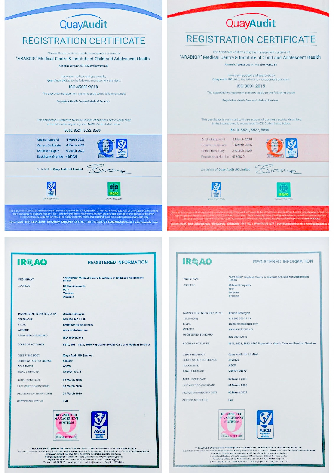 Որակի կառավարման համակարգի և Աշխատանքի անվտանգության և առողջության պաշպանության կառավարման համակարգի պահանջների ներդրման և ապահովման համար «Արաբկիր» բժշկական համալիրը անցել է ISO 9001:2015 և ISO 45001:2018 միջազգային ստանդարտների պահանջներին համապատասխանության սերտիֆիկացում։