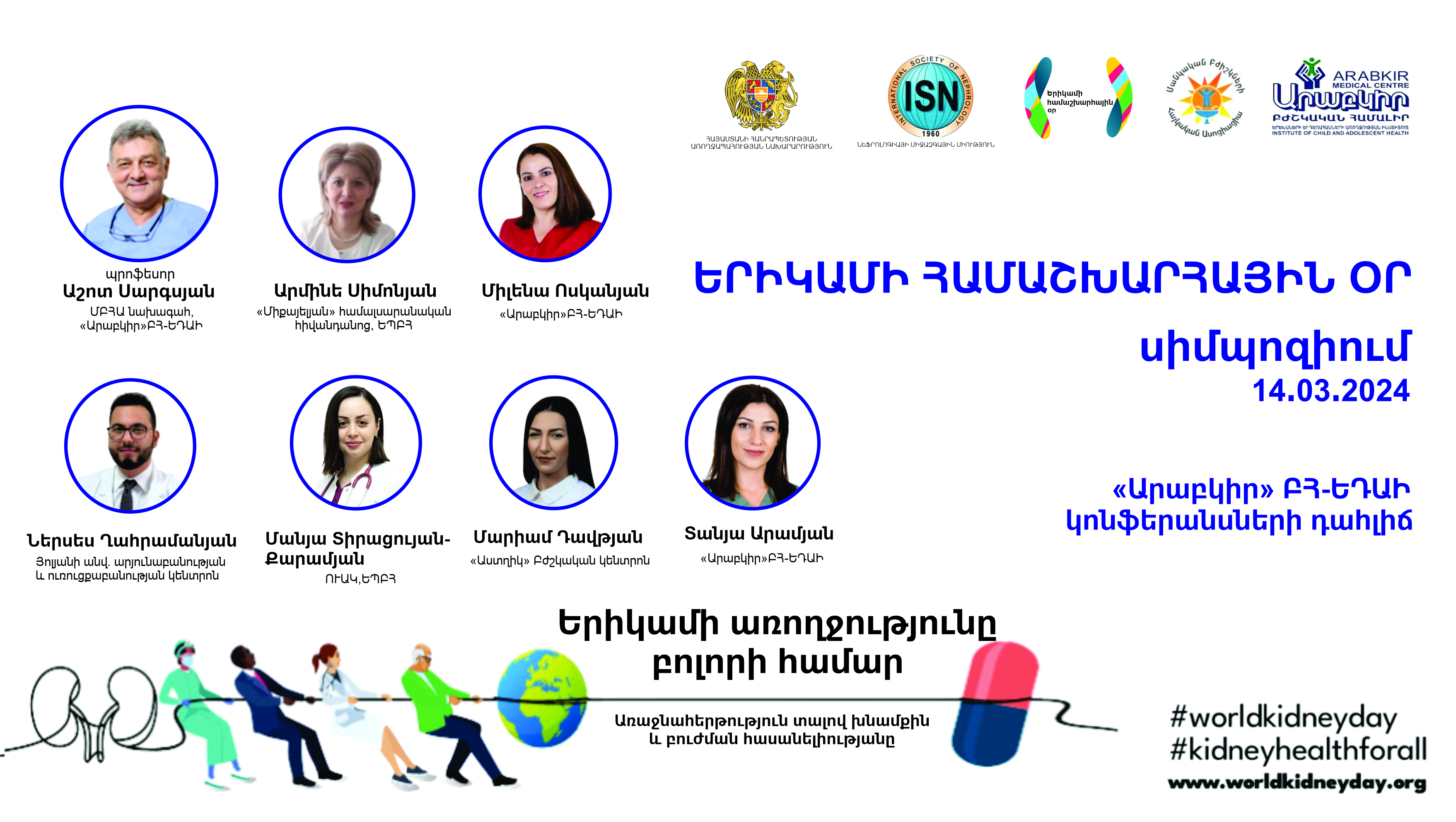 The “Arabkir” Medical Center, the Armenian Pediatric Association, the Armenian Physicians’ Association of Nephrology, Dialysis and Transplantation, in collaboration with the International Society of Nephrology, are joining this initiative. We invite nephrologists, hemodialysis specialists, and all others interested to participate in the “World Kidney Day” symposia. The symposia will be held on March 14th at 15:30 in the conference hall of the medical center, located at Mamikonyants 30. The target audience includes adult and pediatric nephrologists, hemodialysis specialists, and transplantologists.
