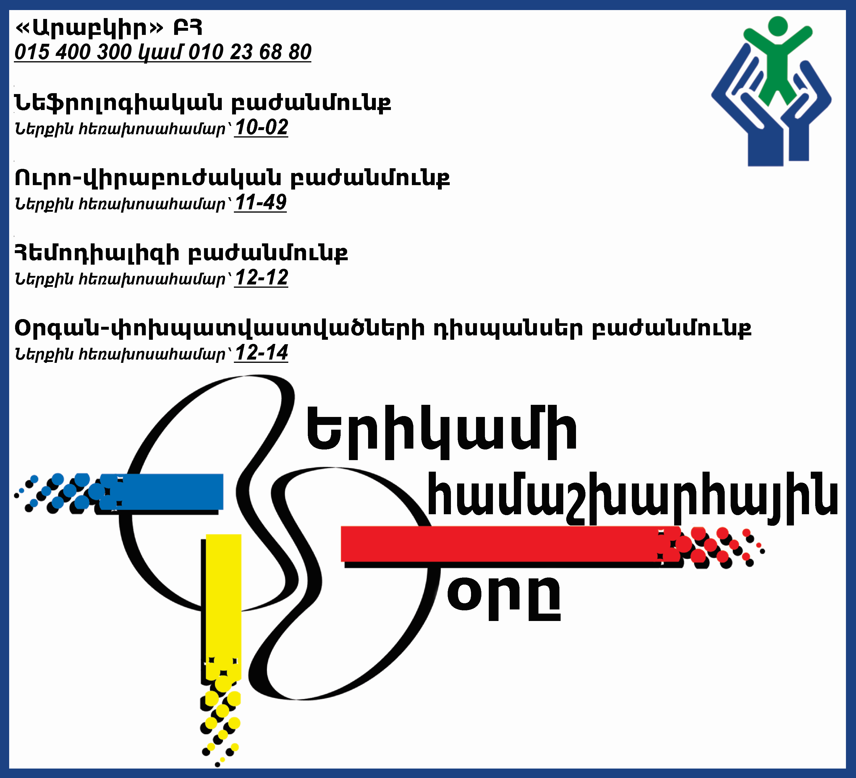 Առողջություն մաղթելով մեր պացիենտներին և բոլորին` միանում ենք միջազգային մեր գործընկերների հորդորներին և հիշեցնում, որ ցանկացած հիվանդություն, այդ թվում և երիկամային խնդիրները, ավելի հեշտ է կանխարգելել, քան բուժել: