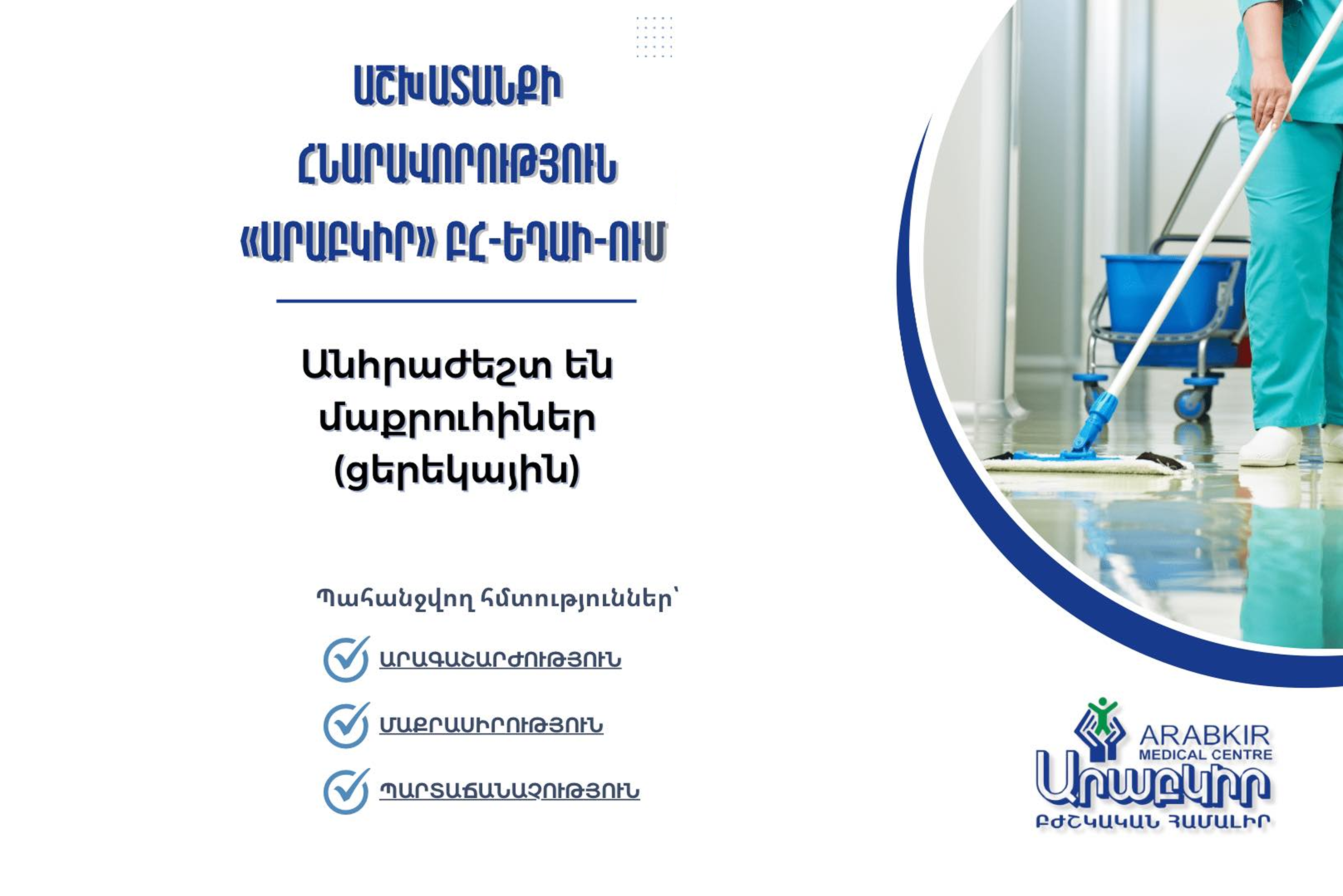 «Արաբկիր» բժշկական համալիրին շտապ անհրաժեշտ են սանիտարներ/մաքրուհիներ: