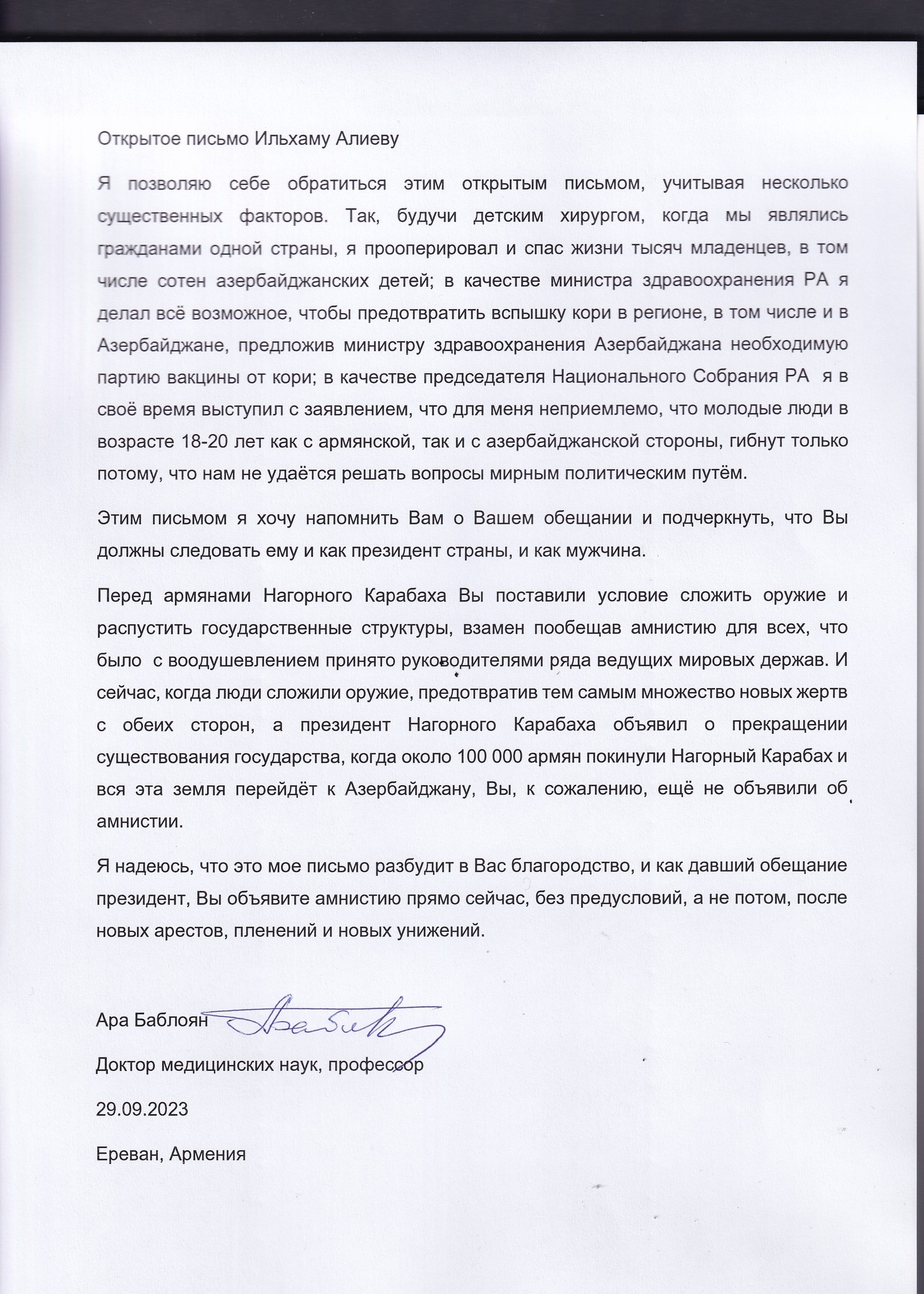 Открытое письмо Ильхаму Алиеву   Я позволяю себе обратиться этим открытым письмом, учитывая несколько существенных факторов. Так, будучи детским хирургом, когда мы являлись гражданами одной страны, я прооперировал и спас жизни тысяч младенцев, в том числе сотен азербайджанских детей; в качестве министра здравоохранения РА я делал всё возможное, чтобы предотвратить вспышку кори в регионе, в том числе и в Азербайджане, предложив министру здравоохранения Азербайджана необходимую партию вакцины от кори; в качестве председателя Национального Собрания РА я в своё время выступил с заявлением, что для меня неприемлемо, что молодые люди в возрасте 18-20 лет как с армянской, так и с азербайджанской стороны, гибнут только потому, что нам не удаётся решать вопросы мирным политическим путём.   Этим письмом я хочу напомнить Вам о Вашем обещании и подчеркнуть, что Вы должны следовать ему и как президент страны, и как мужчина. Перед армянами Нагорного Карабаха Вы поставили условие сложить оружие и распустить государственные структуры, взамен пообещав амнистию для всех, что было с воодушевлением принято руководителями ряда ведущих мировых держав. И сейчас, когда люди сложили оружие, предотвратив тем самым множество новых жертв с обеих сторон, а президент Нагорного Карабаха объявил о прекращении существования государства, когда около 100 000 армян покинули Нагорный Карабах и вся эта земля перейдёт к Азербайджану, Вы, к сожалению, ещё не объявили об амнистии. Я надеюсь, что это мое письмо разбудит в Вас благородство, и как давший обещание президент, Вы объявите амнистию прямо сейчас, без предусловий, а не потом, после новых арестов, пленений и новых унижений.   Ара Баблоян Доктор медицинских наук, профессор 29,09,2023 Ереван, Армения